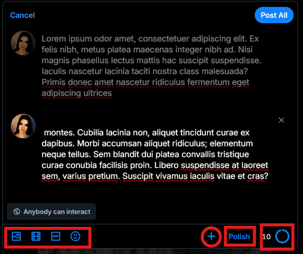 Skeet/post to krótka publiczna wiadomość, limitowana do 300 znaków. Boisz się, że to nie wystarczy? Spokojnie! Pisząc Skeeta na dole znajdziesz plusa. System pokazuje Ci, czy mieścisz się w limicie. Gdy go osiągniesz, wystarczy wcisnąć tego plusa. BlueSky utworzy tzw. wątek, czyli utworzy kolejny skeet w tym wątku i przeniesie Ciebie do niego. Możesz znowu pisać. Czynność można powtarzać wielokrotnie, ale z szacunku do Twoich czytelników, gdy chcesz operować naprawdę długimi tekstami jak ten, polecam WhiteWind, o którym opowiem Ci później. Funkcjonalność wątkowania skeeta działa tak samo w komentarzach