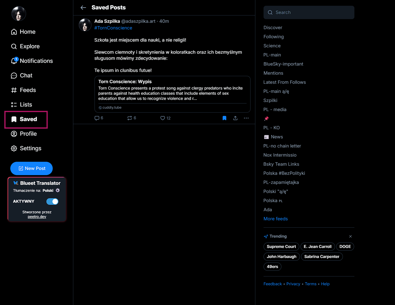 Jeśli nie lubisz polityki, polecam eksperymentalny Feed od @pandoski.bsky.social