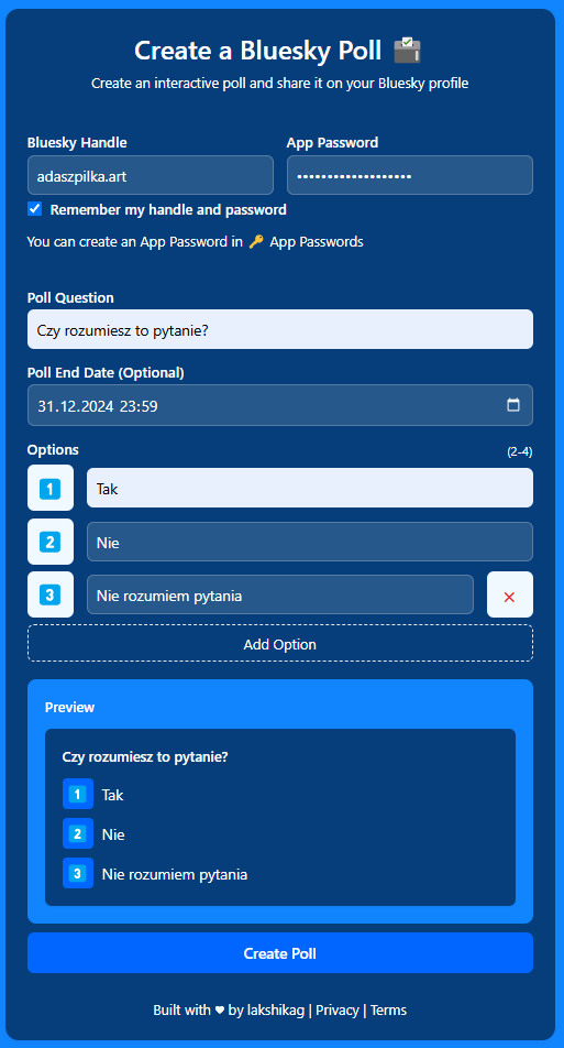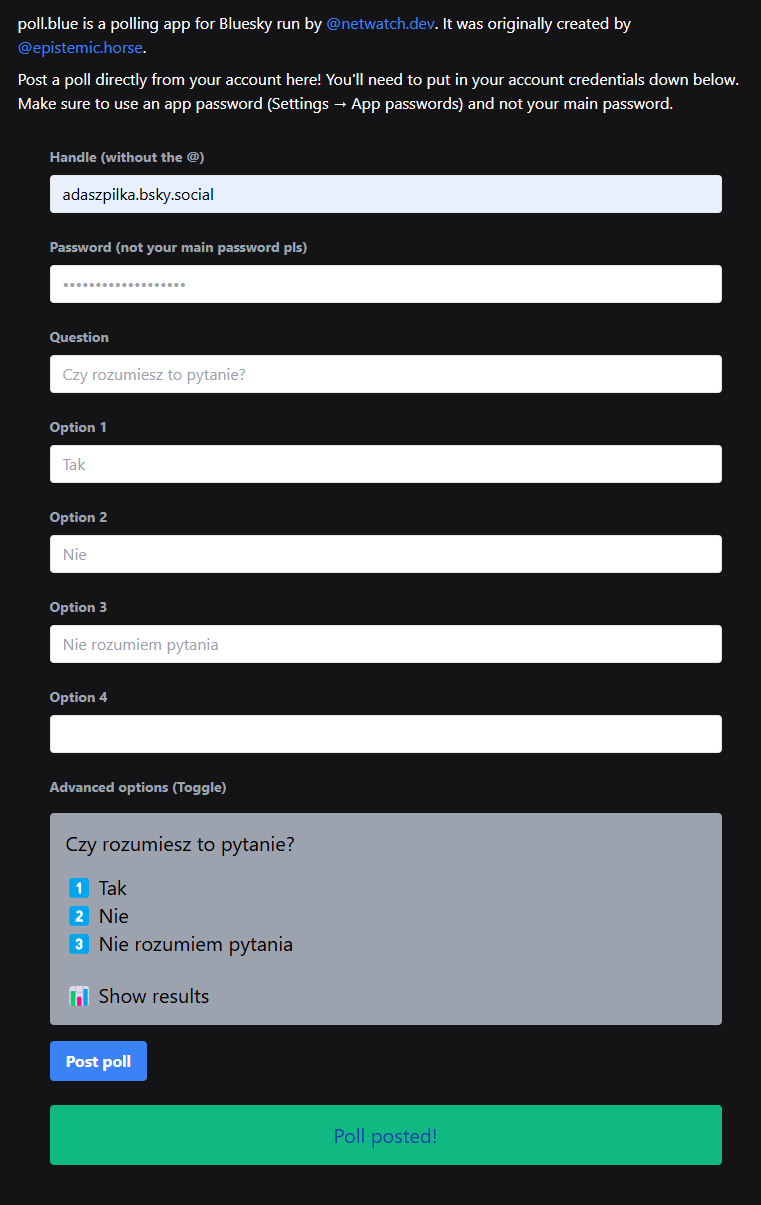 Filozofia wielu usług opartych na protokole AT powoduje konieczność logowania się na innych stronach w celu np. napisania bloga, czy stworzenia ankiet. BlueSky poleca używanie do tego logowań 0Auth (czyli przez stronę BlueSky), badź używania haseł aplikacji, a nie głównego hasła do platformy, przy czym oba rozwiązania są bezpieczne. To znacząco wpływa na Twoje poczucie komfortu.
