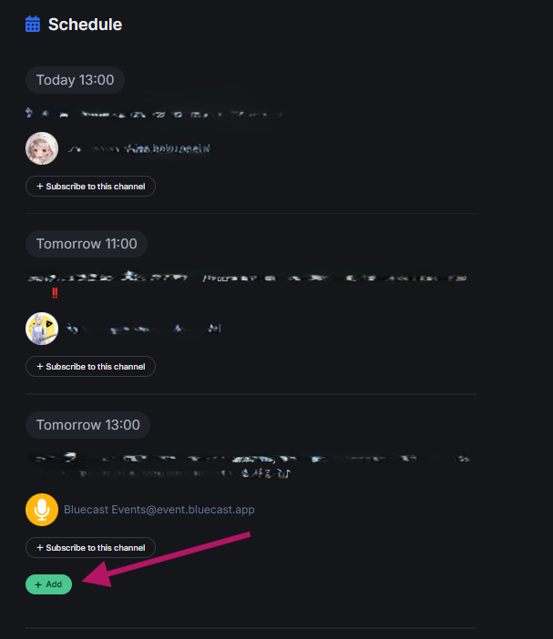 Aby poinformować swoich subskrybentów o planowanej audycji, należy kliknąć na ikonkę +Add, jak na zdjęciu poniżej