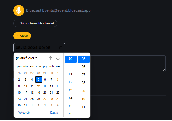 Pojawi się okienko do wpisów, jak na poniższym zdjęciu. Pierwsze dotyczy daty i godziny, a drugie z opisem "Content" służy do wpisania przez Ciebie informacji o nadchodzącej audycji. Gdy klikniesz na ikonkę kalendarza w okienku, możesz zaplanować wydarzenie.