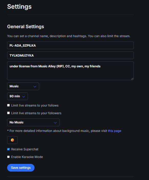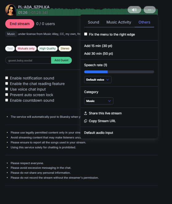 - Share this live stream - okno umożliwiające wysłanie skeeta o audycji (mozesz wpisać tam np. informację że za X minut będzie rozmowa z ważnym gościem