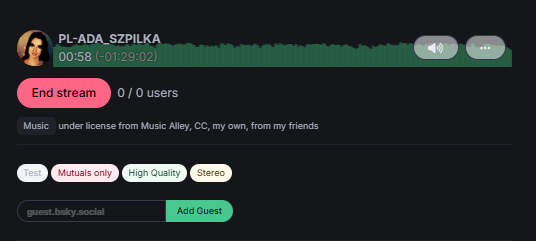 Kliknij „Start Streaming”, aby rozpocząć audycję. Zostanie to ogłoszone skeetem na Twoim Bluesky. Jeśli jesteś w trybie PRO i mimo rozpoczętej transmisji goście się nie pojawiają, sprawdź, czy „Tryb testowy” jest włączony.