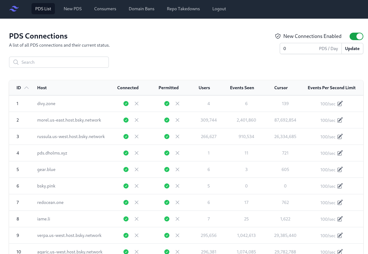 The demo Relay described here is running at relay-ovh.demo.bsky.dev. It handles crawling and re-publishing the full network firehose, with headroom for traffic spikes and growth on a number of dimensions: new accounts (repos), new PDS instances, more content being created (firehose event rate), number of services consuming from the firehose, etc.