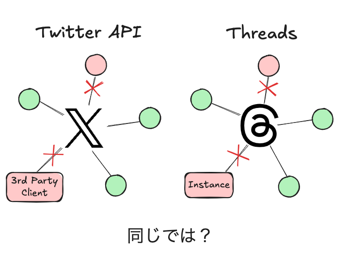 したがって、Blueskyが目標とするBig Fediは実現しません。「Threads」が事実上の中央集権型SNSとしてTwitterの代替になれる可能性はあっても、「ActivityPub連合」がTwitterに取って代わることは難しいでしょう。