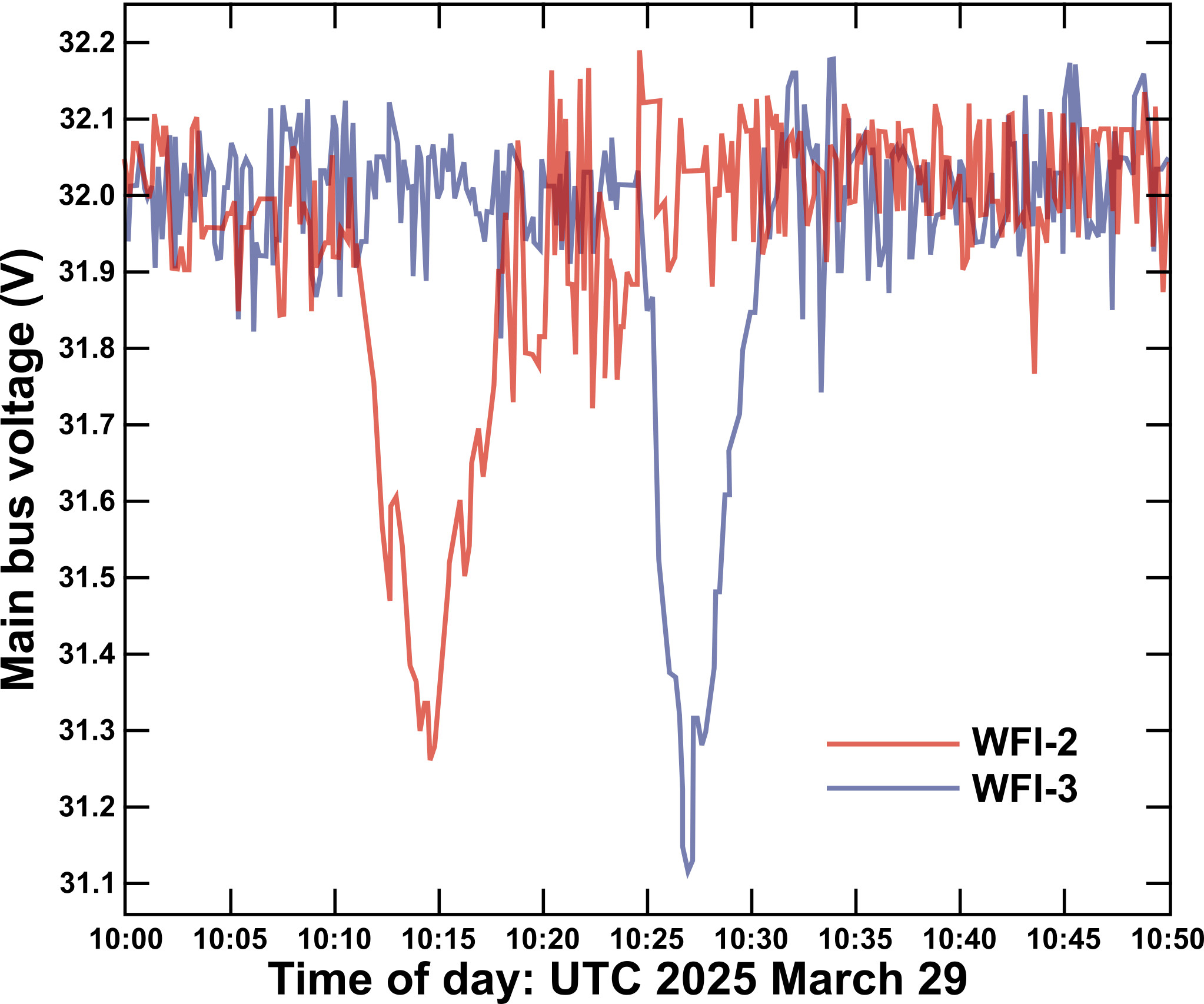 On March 29, 2025, many folks went outside to catch a glimpse of the partially eclipsed Sun, as the Earth carried them through the Moon’s shadow. PUNCH, orbiting high overhead, also passed through the shadow. Orbital velocities are high, so each spacecraft passed through the darkest part of the partial eclipse (the Moon’s penumbra) at a slightly different time, about eight minutes apart. Even though the instruments’ doors are still closed for commissioning, PUNCH registered the eclipse. During the brief interval of darkest shadow, the solar arrays couldn’t keep up with on-board power usage and each spacecraft briefly switched to battery power, using slightly less than 1% of its battery capacity to keep operating normally through the brief gap.