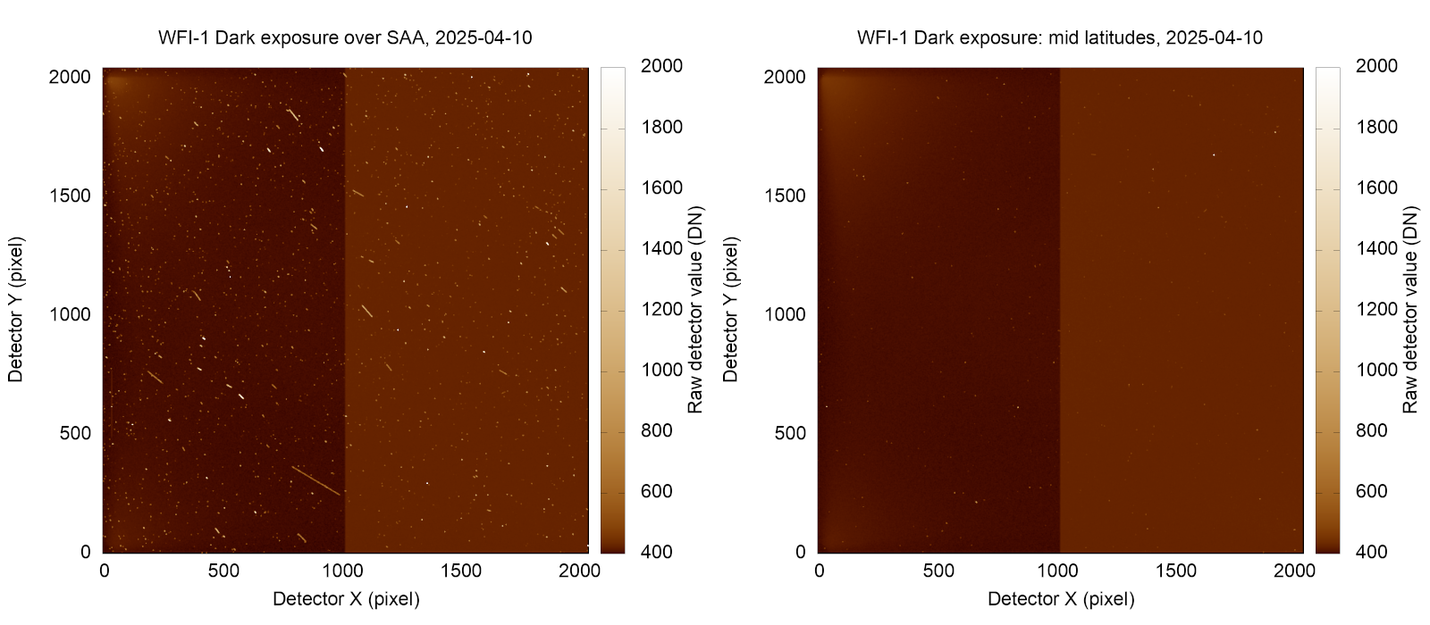 Two dark frames collected from WFI-1 on 2025-04-10 show a few important effects in the darkest 3% of the dynamic range: low detector read noise, dual-readout digitizer offsets, very faint glint coming from the instrument door, and radiation over the South Atlantic Anomaly.