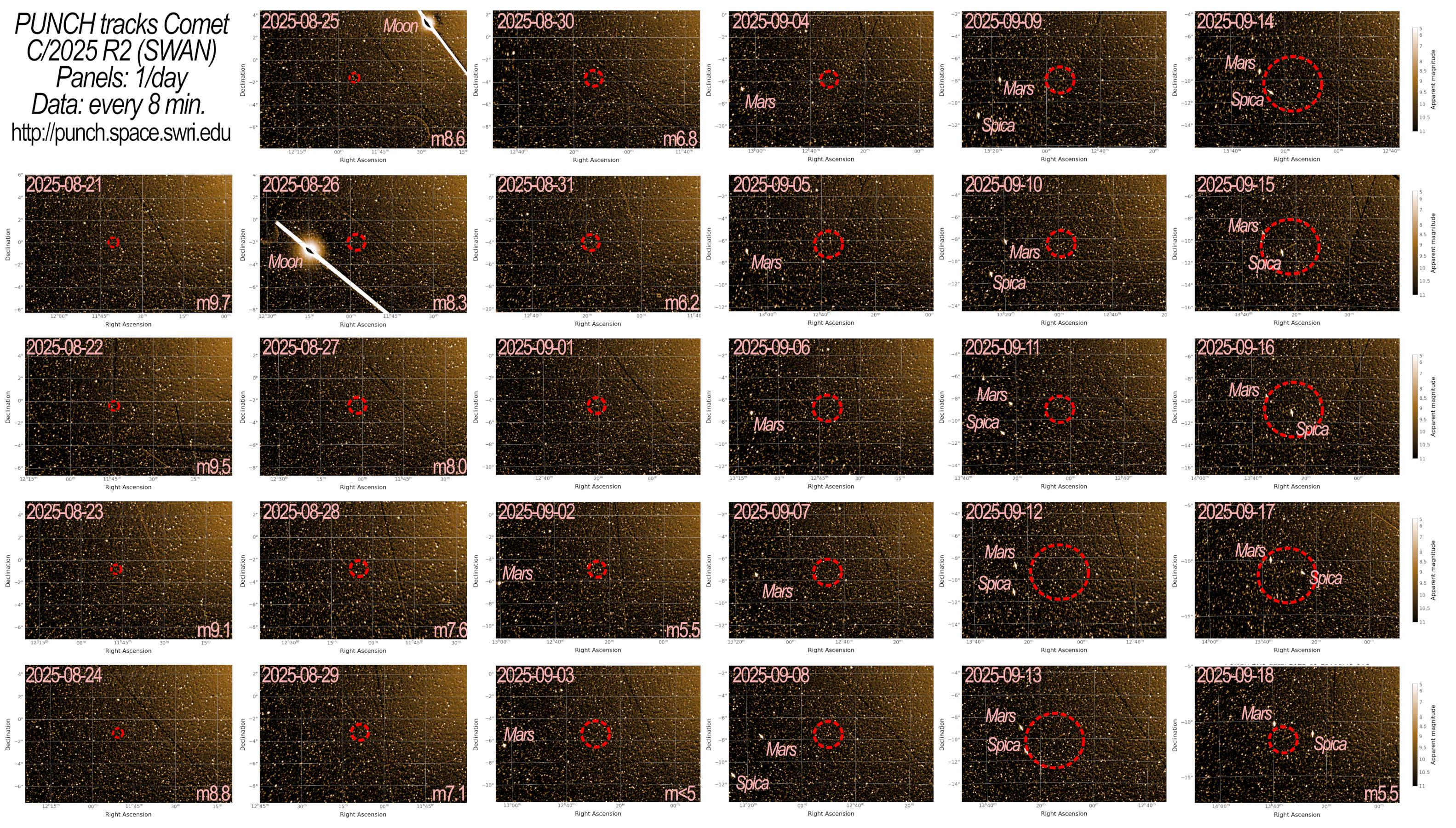Last week, astronomers announced a new comet, designated C/2025 R2 (SWAN), that was first seen in Lyman-α images from the [https://sohowww.nascom.nasa.gov](SOHO spacecraft). Since mid-August, PUNCH has been observing this comet (along with every other object within 45° of the Sun). PUNCH collects data at a 4-minute cadence in polarized light and at an 8-minute cadence in unpolarized light.