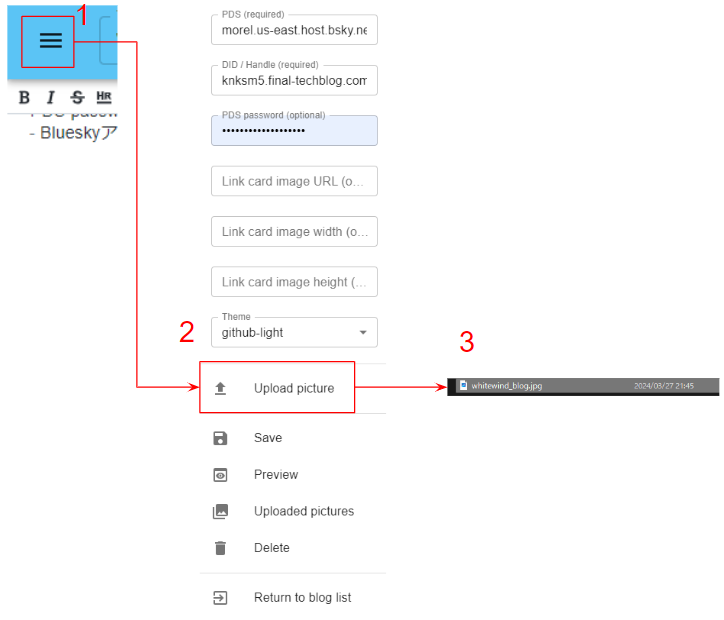 In the blog editing screen, there are text boxes labeled "DID / Handle" and "PDS password" within the hamburger menu (three horizontal lines icon). If you have not logged in, enter the following information in these text boxes: